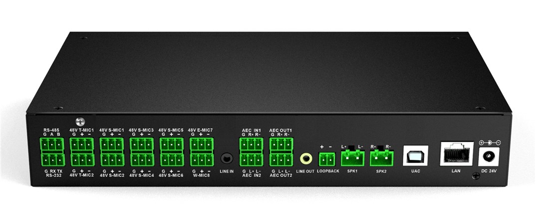 4、音頻接口具有矩陣功能,可自定義吊麥、無線麥、 全向拾音麥、鵝頸麥、本地線路、遠(yuǎn)端互動(dòng)信號(hào)等輸 入輸出,具有輸入信號(hào)的優(yōu)先機(jī)制;