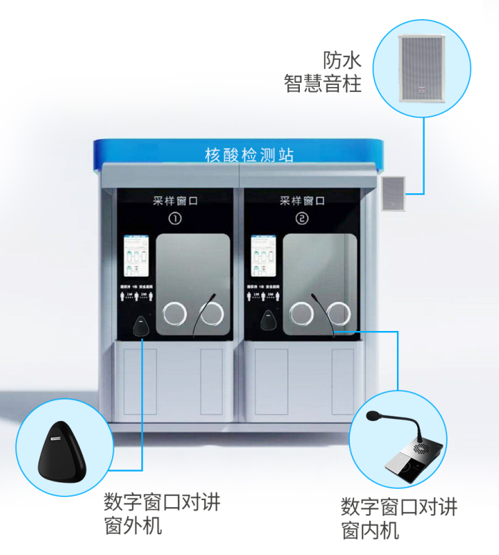 即醫(yī)護(hù)采樣人員在采樣窗口既能與被采樣人順暢溝通,又能完成喊話廣播維持艙外排隊(duì)秩序、播放通知。