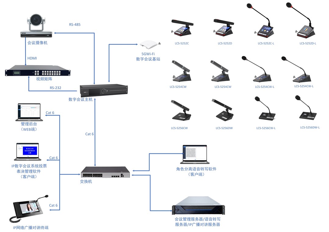 系統(tǒng)支持六類網(wǎng)線手拉手連接,同時支持2.4G/5.2G/5.8G三頻WIFI組網(wǎng),同時支持最大10人發(fā)言,有線無線單元均支持會議發(fā)言、攝像追蹤、會議簽到、投票表決、EQ調(diào)節(jié)等功能。
