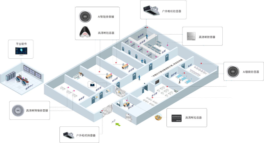 關(guān)于拾音器的設(shè)計(jì)部署指揮中心:在指揮中心部署后臺(tái)管理軟件,可以對(duì)接入的拾音設(shè)備進(jìn)行狀態(tài)監(jiān)視、故障報(bào)警、軟件升級(jí)和相關(guān)性能參數(shù)調(diào)整,便于隨時(shí)掌握拾音設(shè)備運(yùn)行狀態(tài)。監(jiān)室/禁閉室/等候室:監(jiān)室、禁閉室、監(jiān)獄醫(yī)院、室內(nèi)公共區(qū)域等場景,建議在此多點(diǎn)位部署拾音器,確保做到全天時(shí)無死角監(jiān)聽。在側(cè)墻處、天花板處安裝具備防破壞性、隱蔽性高、抗混響設(shè)備。審訊室/談話室/會(huì)見室:在審訊室、談話室、會(huì)見室等近距離桌面拾音環(huán)境,推薦在桌面部署桌面型拾音器可以有效拾取雙方近距離音源屏蔽其它音源干擾,聲音更清晰;再部署一個(gè)環(huán)境型拾音器對(duì)全室聲音進(jìn)行拾取。拾音器通過與攝像頭聯(lián)動(dòng),同步錄音錄像,確保審訊/談話/會(huì)見時(shí)的錄像錄音備份公正。周界/武警崗?fù)?AB門/放風(fēng)場:室外區(qū)域具有環(huán)境噪聲大、人員聚集多、晝夜溫差大、環(huán)境惡劣等特點(diǎn),對(duì)于此處需要高清拾音,但傳統(tǒng)拾音器普遍效果較差無法達(dá)到理想效果。通過部署槍擊型拾音器對(duì)室外周邊區(qū)域位置進(jìn)行聲音監(jiān)控。降低后期維護(hù)成本,提高工作效率。有效預(yù)防突發(fā)事件,做到事前預(yù)防、事中控制有效、事后處理規(guī)范。