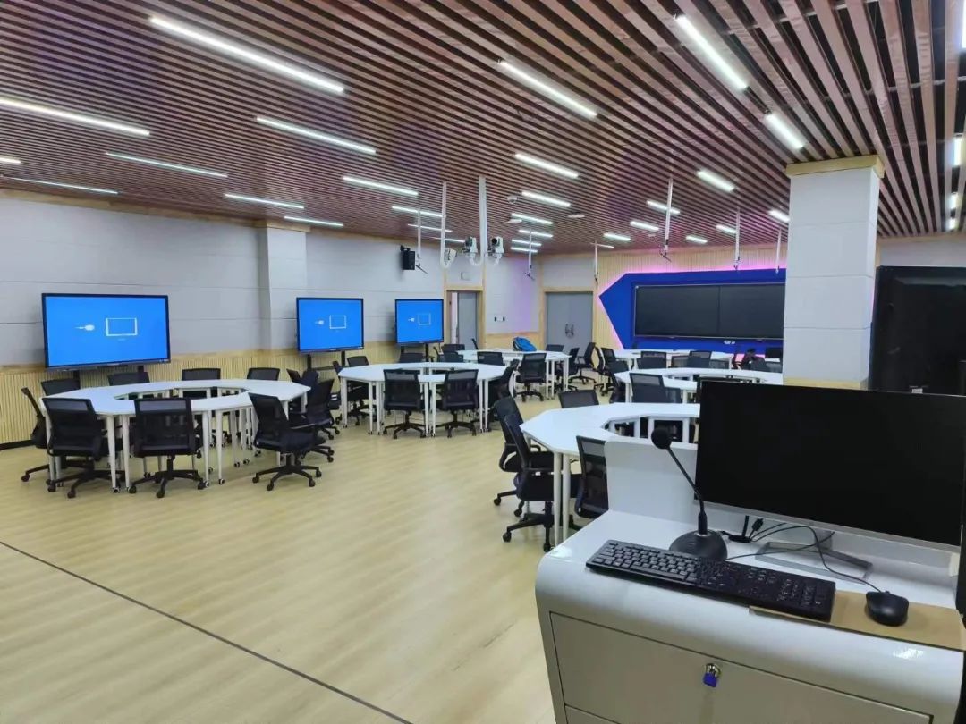 通過(guò)智能中控系統(tǒng),能一鍵開(kāi)啟教室的聲光電等設(shè)備,例如打開(kāi)電源、燈光照明、電動(dòng)窗簾等,操作簡(jiǎn)單,十分便捷。另外教室還采用了世邦擴(kuò)聲音箱,會(huì)議發(fā)言系統(tǒng)含有線話筒和無(wú)線手持話筒,是科技感十足的現(xiàn)代化智能多媒體教室。