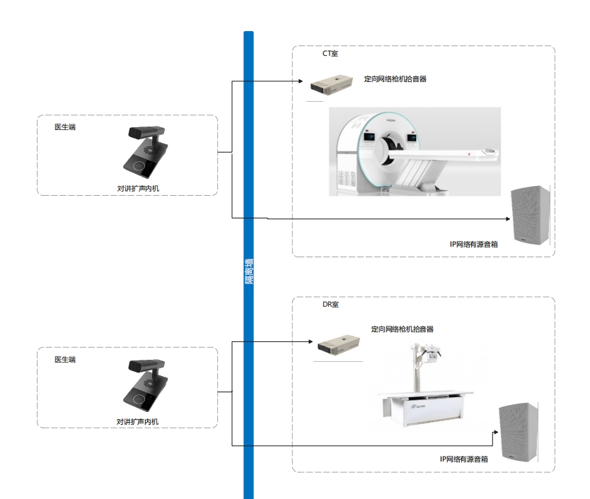 核磁醫(yī)檢對(duì)講擴(kuò)聲系統(tǒng)可在高噪聲環(huán)境下使用,具備全雙工對(duì)講、主動(dòng)降噪等功能,在核磁醫(yī)檢場(chǎng)景下,可滿(mǎn)足醫(yī)生和患者之間的正常通話(huà)交流需求。目前在國(guó)內(nèi)多家醫(yī)院的放射科室(CT室、DR室)有應(yīng)用。