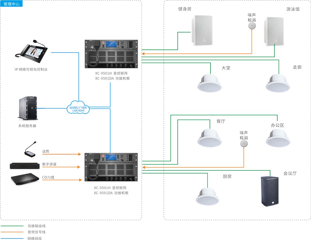 采用矩陣式分區(qū)控制,支持多音源輸入,例如CD、數(shù)字調(diào)諧、模擬話筒等,可實(shí)現(xiàn)任意音源輸出到任意分區(qū)終端,各分區(qū)平行運(yùn)行互不干擾,滿足多場(chǎng)景分區(qū)廣播功能。