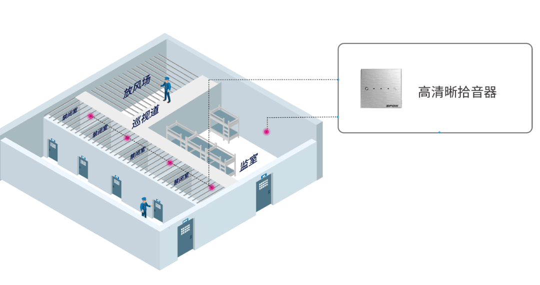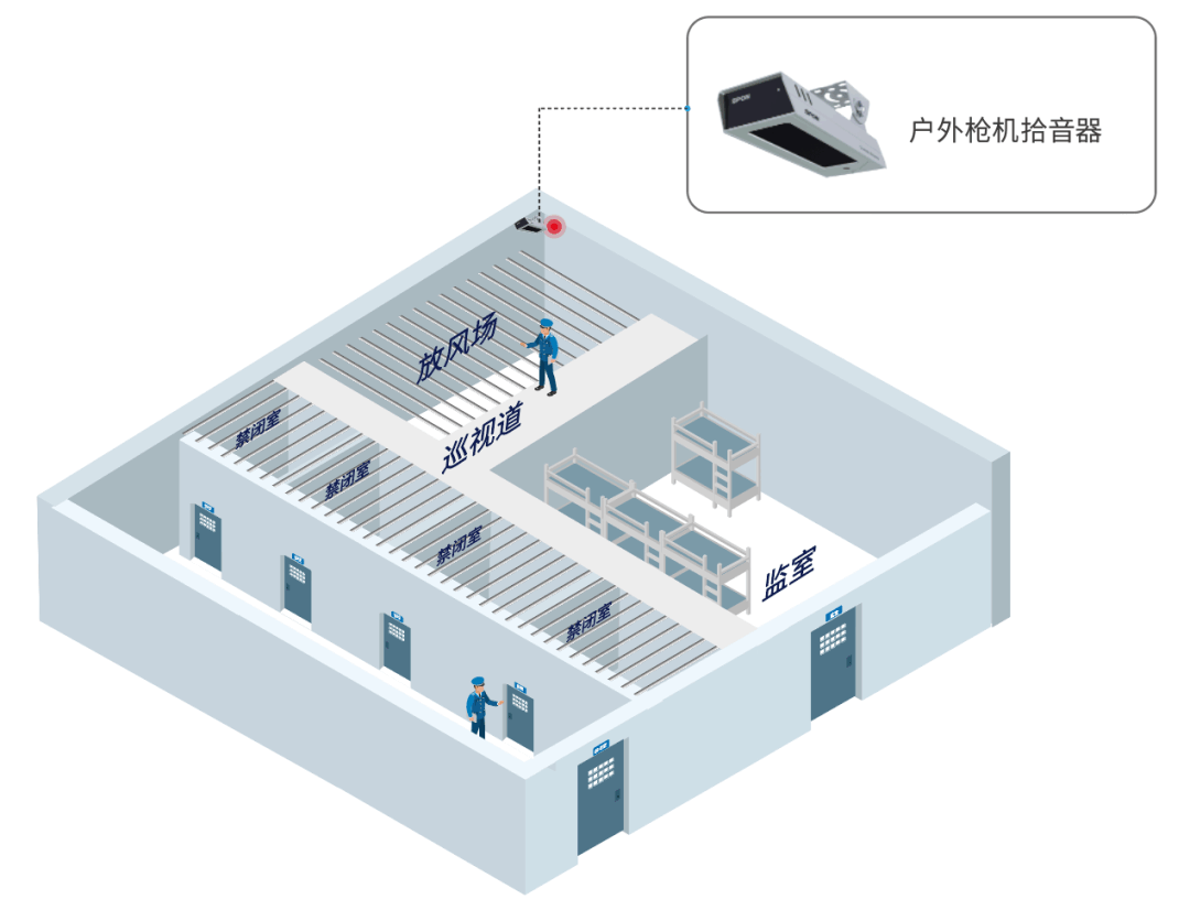 監(jiān)室、禁閉室、監(jiān)獄醫(yī)院、室內(nèi)公共區(qū)域等場景,建議在此多點(diǎn)位部署拾音器,確保做到全天時無死角監(jiān)聽。在側(cè)墻處、天花板處安裝具備防破壞性、隱蔽性高、抗混響設(shè)備。
