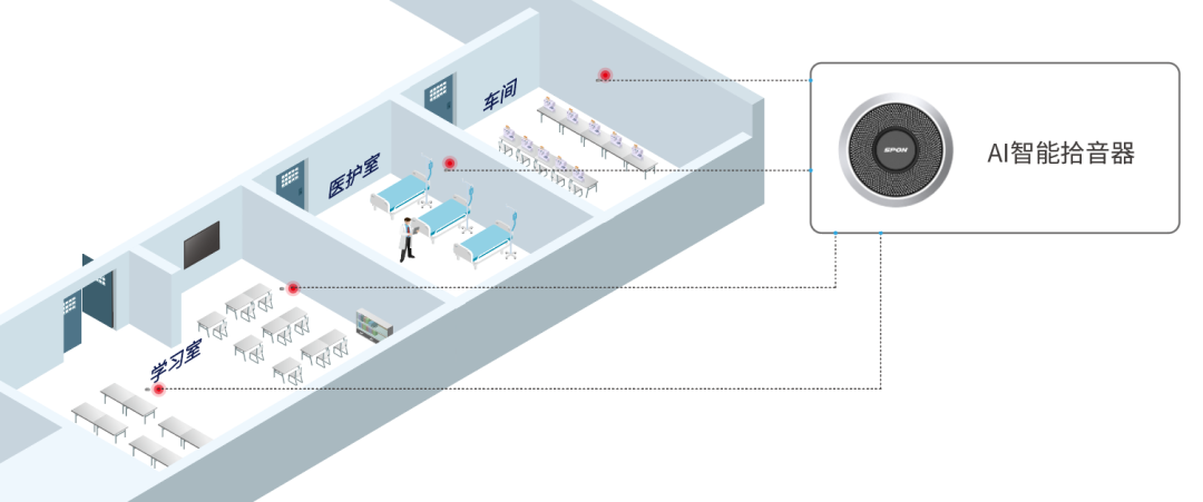 建議在監(jiān)室、車間、學(xué)習(xí)室等重要區(qū)域部署AI型智能網(wǎng)絡(luò)拾音器,可對周邊環(huán)境噪音的干擾濾除、工頻干擾抑制,提升對人和環(huán)境有效聲音的監(jiān)控,提升聲音復(fù)核的語音清晰度。