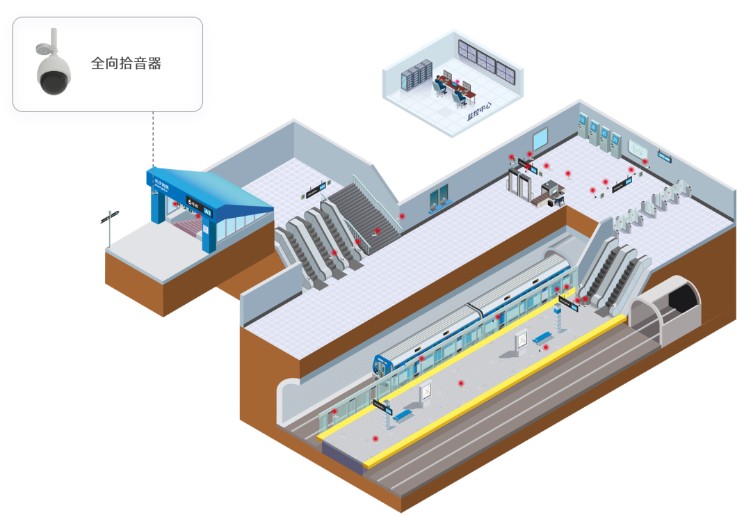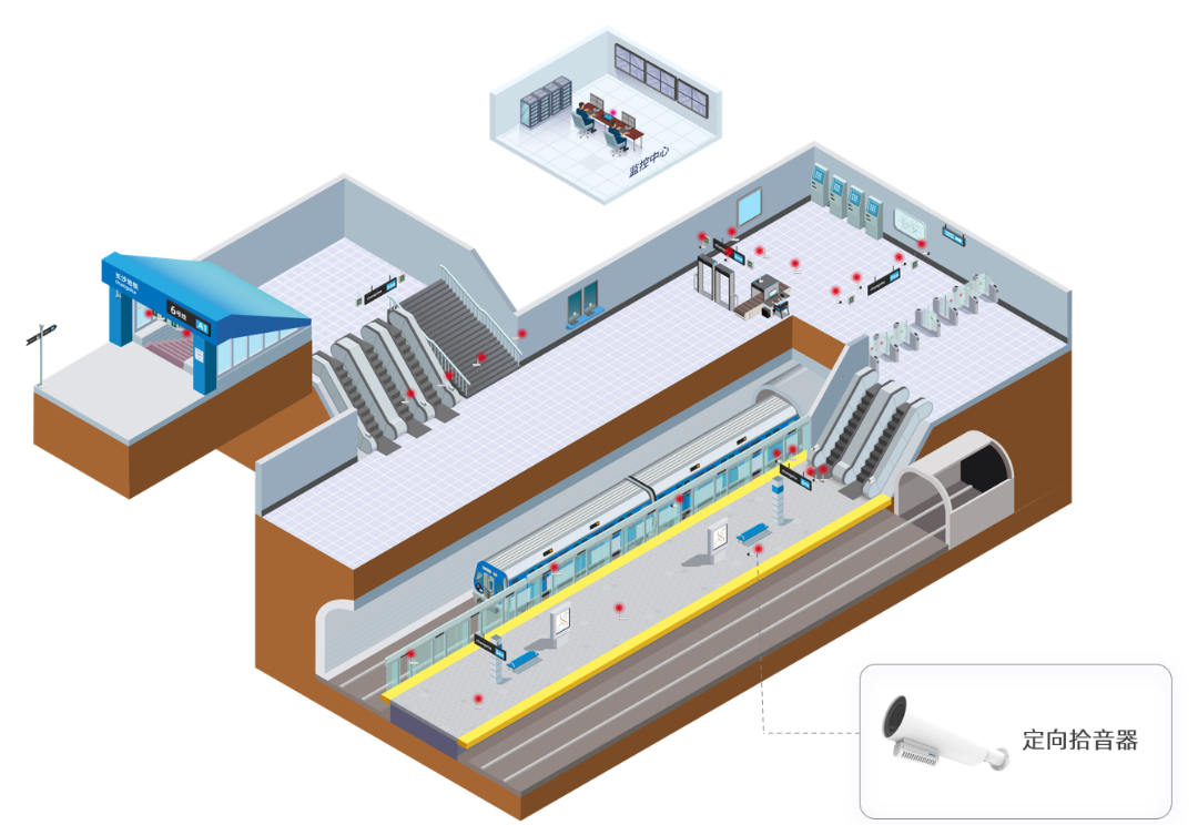 部署方案:通過部署定向型拾音器對主要通道進行聲音監(jiān)控,為事件發(fā)生原因、聚集討論目的、司乘人員糾紛提供依據降低后期維護成本,提高工作效率。有效預防突發(fā)事件,做到事前預防、事中控制有效、事后處理規(guī)范。